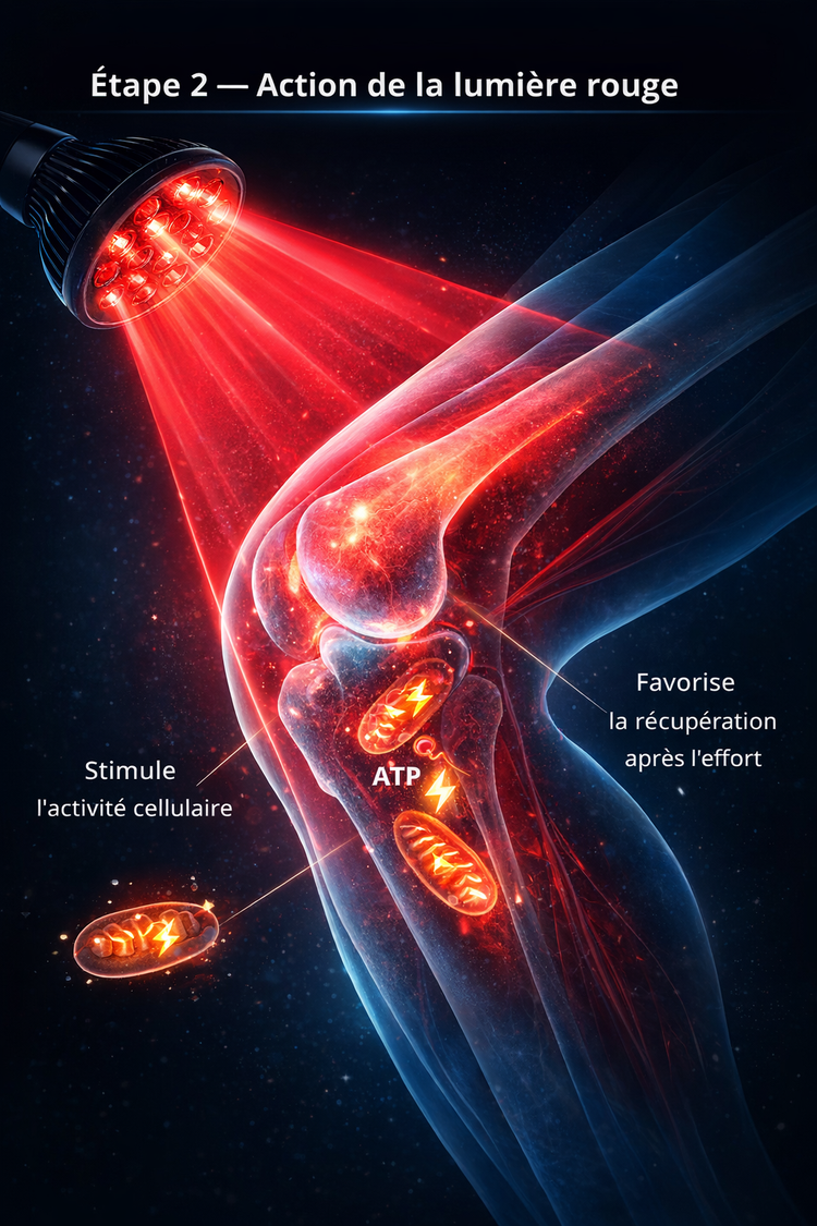 La lumière rouge est utilisée en récupération sportive pour améliorer la récupération du genou après l’effort et les tensions répétées.